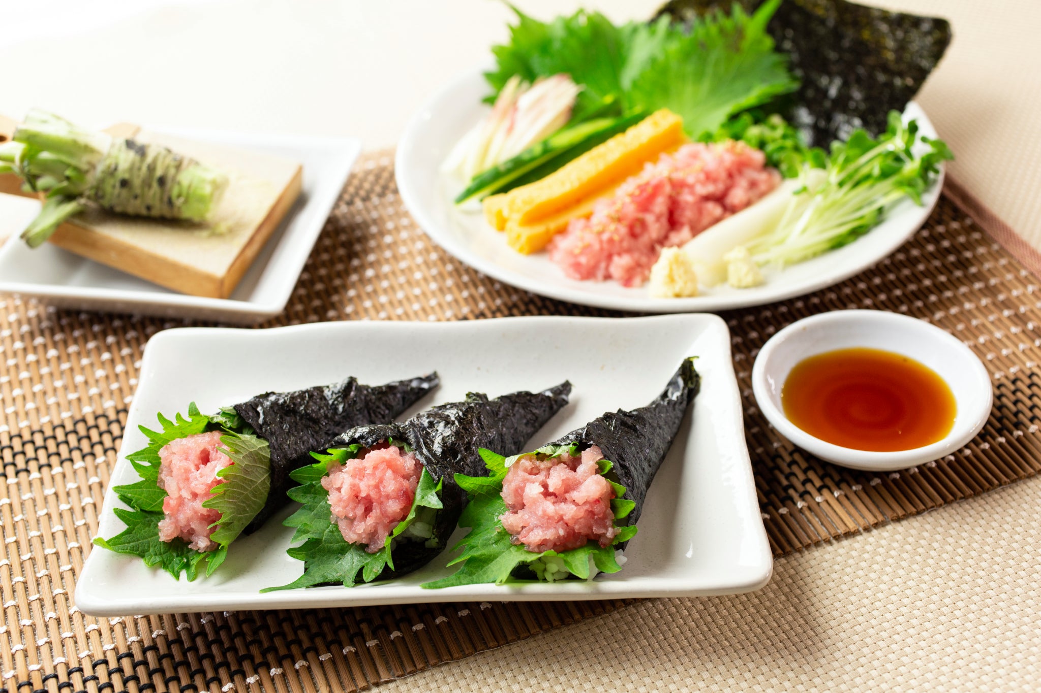 - 大葉を敷いたら、大和芋、納豆、オクラ、ネギトロを乗せ、最後に温泉タマゴ、ゴマ、キザミのり、穂しそをトッピングする。