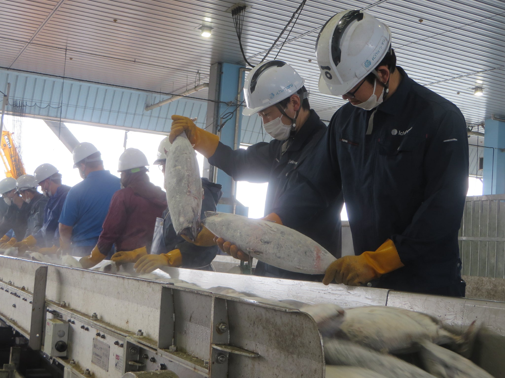 焼津港で水揚げするかつおを「目利きのプロ」として活躍している社員が選別。