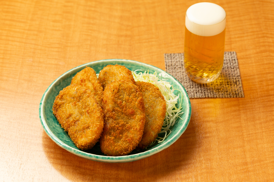 黒はんぺんには小判~大判のサイズがあり、本商品は現社長の「お腹いっぱいになってほしい」というこだわりから大判を使用。厚みがあって食べ応え充分、おかずにもおつまみにもぴったりの黒はんぺんフライには、ウスターソースや醤油をお好みで。